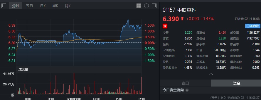 截至今日收盘,中联重科(01157)涨1.43%,报6.39港元。