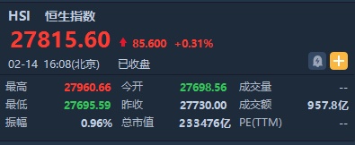 智通财经APP获悉,恒生指数开盘跌0.11%,早盘一度涨逾200点,随后涨幅逐渐收窄,全天呈现冲高回落走势。截至收盘,恒生指数涨85.6点或0.31%,报27815.6点,全日成交额达957.83亿。国企指数涨0.26%,报10863.45点,红筹指数跌0.1%,报4357.78点。