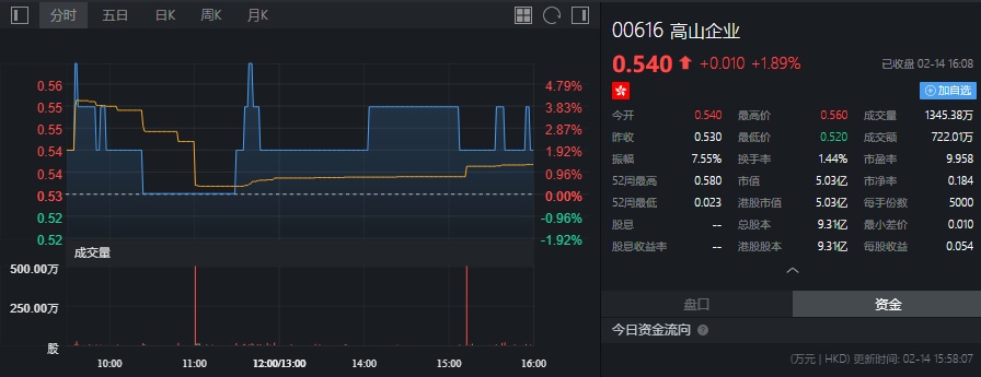 截至今日收盘,高山企业(00616)涨1.89%,报0.54港元。