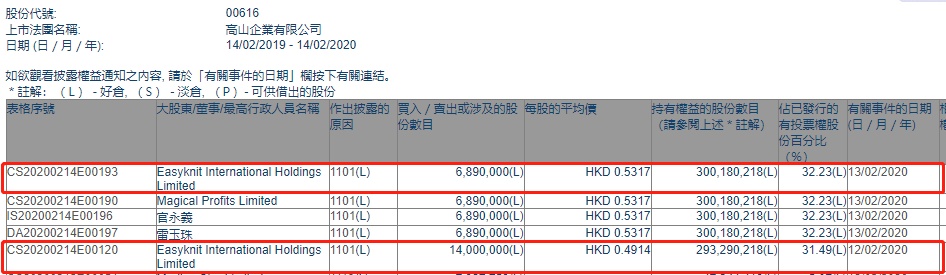 智通财经APP获悉,联交所最新资料显示,2月12日和13日,永义国际(01218)分别增持高山企业(00616)1400万股及689万股,每股分别作价0.4914及0.5317港元,总金额约为1054.30万港元。增持后最新持股数目约为3亿股,最新持股比例为32.23%。