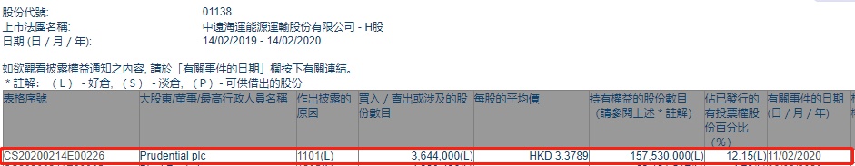 智通财经APP获悉,联交所最新资料显示,2月11日,英国保诚增持中远海能(01138)364.4万股,每股作价3.3789港元,总金额约为1231.27万港元。增持后最新持股数目约为1.58亿股,最新持股比例为12.15%。
