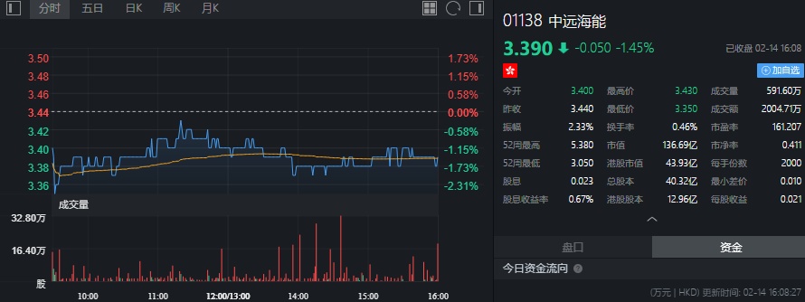 截至今日收盘,中远海能(01138)跌1.45%,报3.39港元。