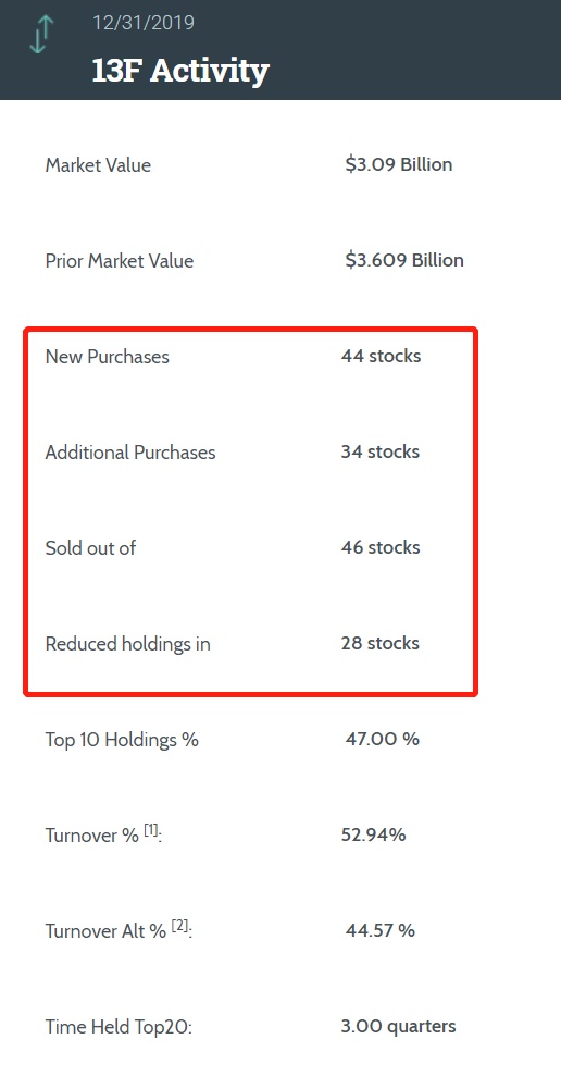 最新数据显示,Q4报告期末索罗斯基金资产市值30.9亿美元,较上一报告期36.09亿美元出现下滑,是这轮13F中为数不多管理规模下滑的知名基金。索罗斯在四季度的持仓组合中新增了44只个股,增持了21只个股;同时,索罗斯还减持了48只个股并清仓了46只个股。