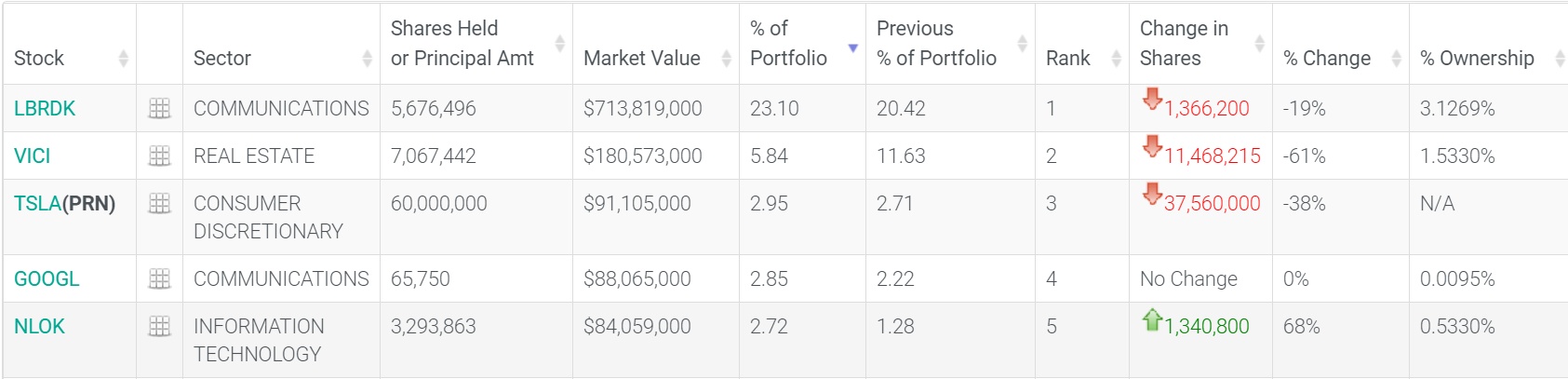 具体看来,Liberty Broadband与前三个季度一样位列第一,占比约23.10%,索罗斯持有其约568万股,总市值约为7亿美元;博彩公司VICI位列第二,占比约5.84%,索罗斯持有约707万股,总市值约为1.8亿美元;排名第三以及第四的是特斯拉债券和谷歌(GOOG.US),分别持有约6000万股和65750股,总市值分别为9110万亿美元和8806万美元,占比分别为2.95%和2.85%;排名第五的是NLOK,占比2.72%,索罗斯持有约329万股,总市值约为8405万美元。
