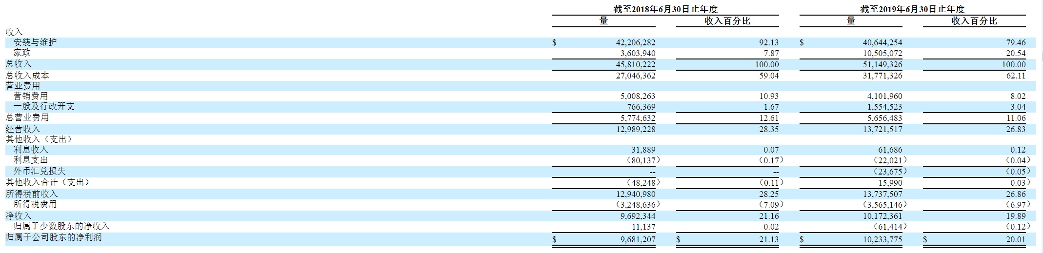 公司的收入来源于两部分,1)安装与维护;2)家政服务。其中安装与维护贡献公司大部分利润,2018年上半年这一占比超过90%,2019年这一比例有所下降,相对应的家政收入占比提升,2019年占其收入的20.54%。