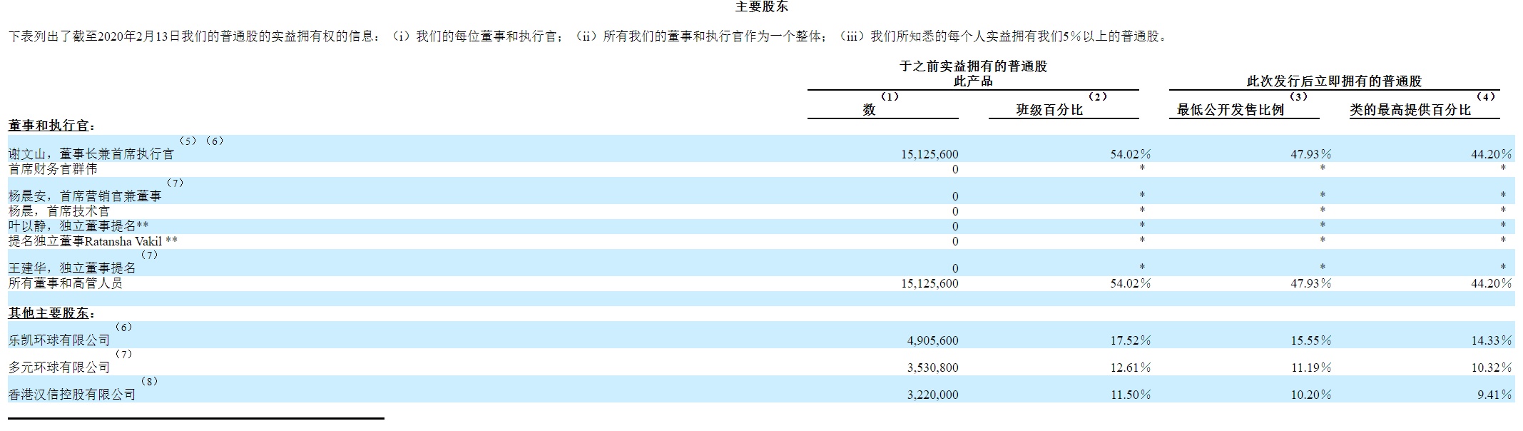 「e 家快服」在上市前的股东结构中,Wenshan Xie持股 54.02%,chuijie Weng通过 Lucky Max Global Limited 持股 17.52%;Jie Lin通过Multi Rise Global Limited 持股 12.61%;Zhijian Bian通过 Hong Kong Hanxin Holdings Limited 持股 11.50%。