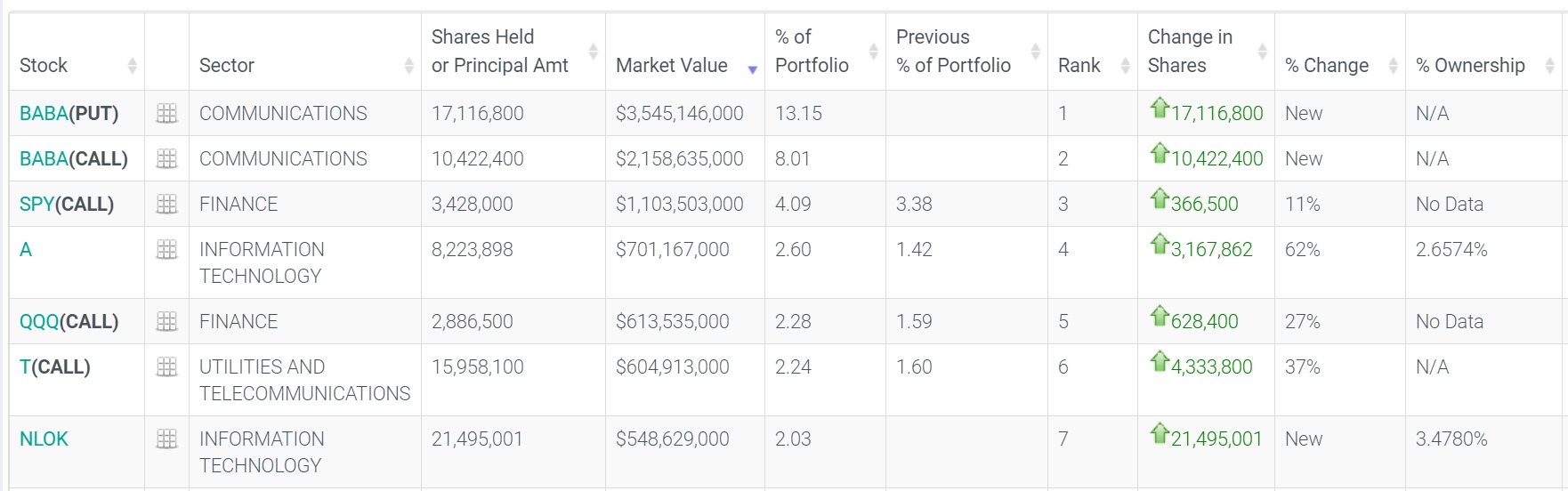 值得一提的是,野村在第四季度还建仓看涨期权等多只衍生品。具体看来,持仓前五中,阿里巴巴看空期权位列第一,占比约13.15%,野村持有其约1711万股,总市值约为35.45亿美元;阿里巴巴看涨期权位列第二,占比约8.01%,野村持有约1042万股,总市值约为21.59亿美元;排名第三以及第四的是标普500指数(SPY.US)和安捷伦科技(A.US),分别持有约343万股和822万股,总市值分别为11.03亿美元和7.01亿美元,占比分别为4.09%和2.60%;排名第五的是纳指100(QQQ.US),占比2.28%,野村持有约289万股,总市值约为6.13亿美元。