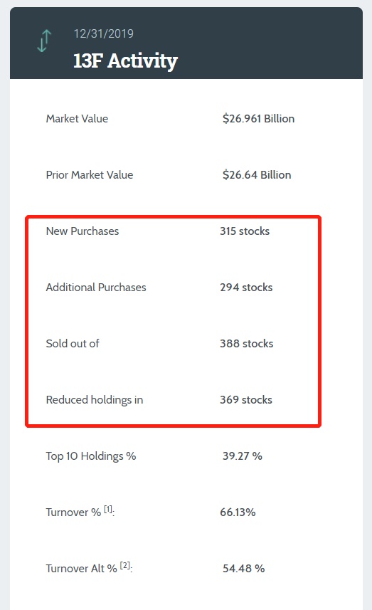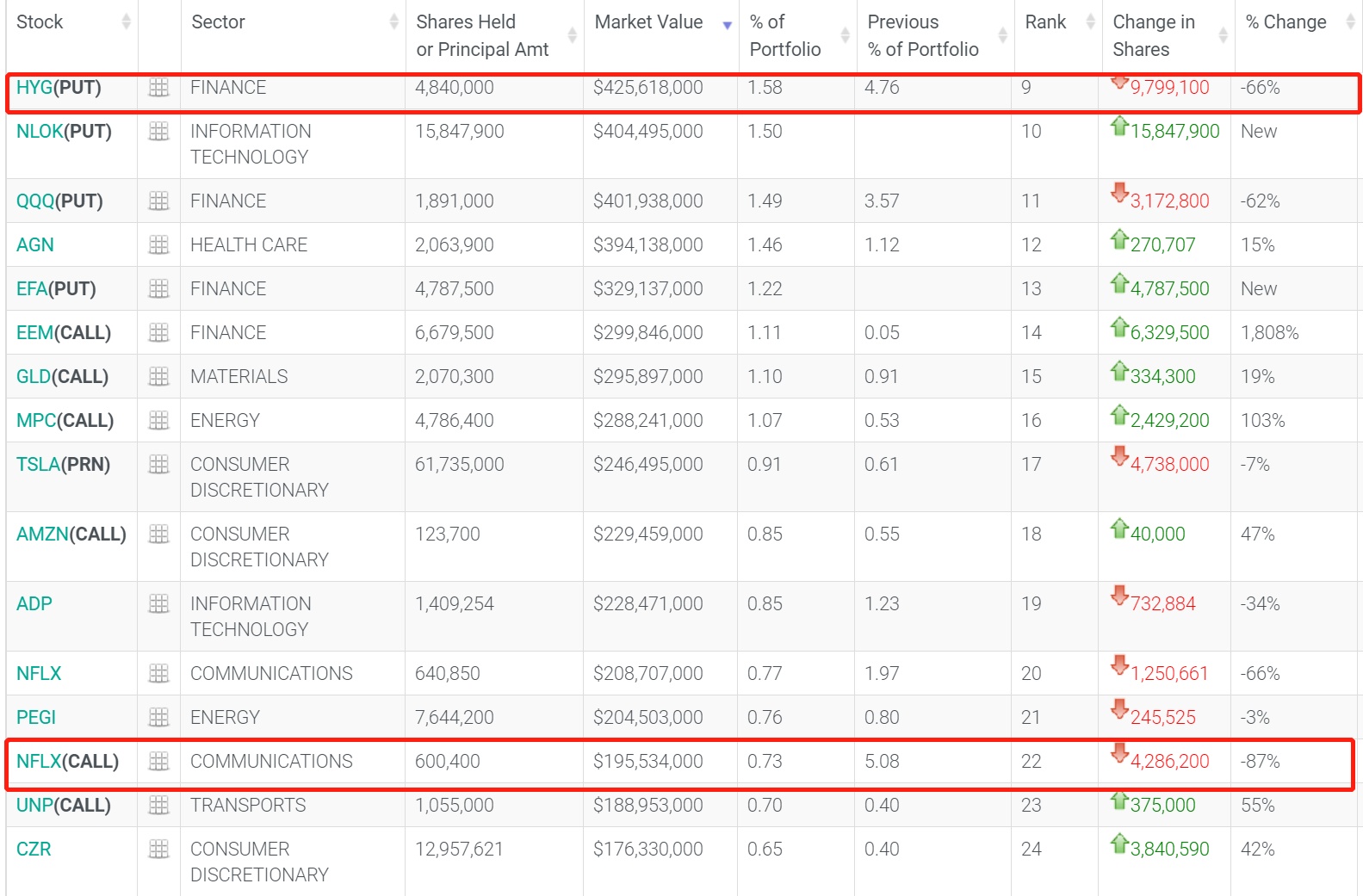 本季度减仓规模前五的股票中,排名第一的是奈飞(NFLX.US),减持429万股,投资百分比由5.08%降低为目前的0.73%。排名第二的是Aramark(ARMK.US),排名第三的是HYG高收益公司债ETF的看跌期权,减持979万股,变化百分比约为66%。排名第四的惠普(HPQ.US),排名第五的是自动化数据处理公司(ADP.US)。