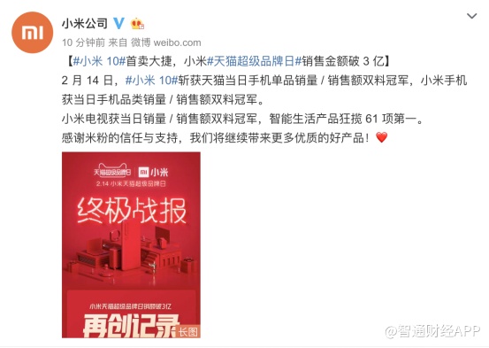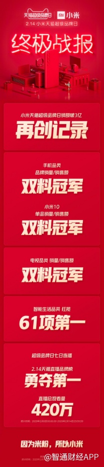 2 月 15 日凌晨,小米(01810)与天猫强强联手打造的“小米天猫超级品牌日”完美落幕。在这场