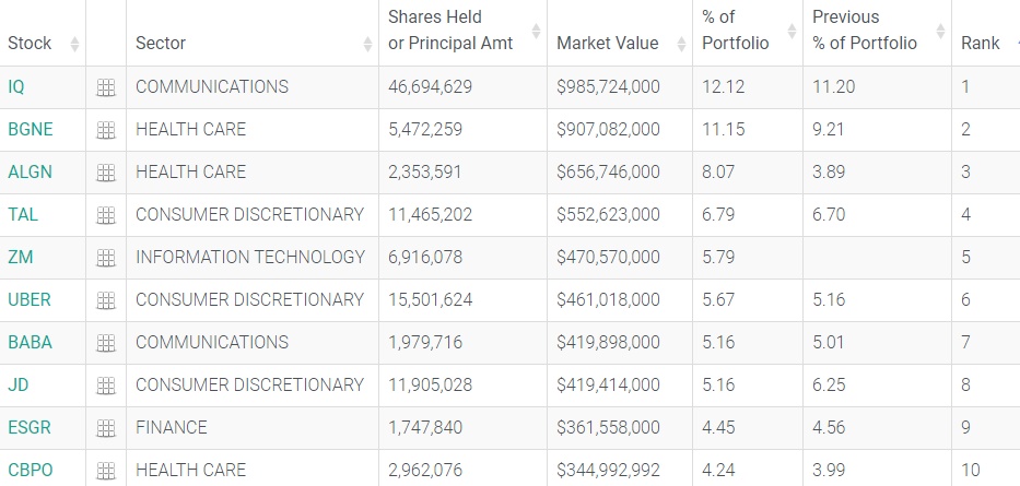 前五大重仓股分别是爱奇艺、百济神州(BGNE.US)、Align科技(ALGN.US)、好未来(TAL.US)和ZOOM(ZOOM.US),持有市值分别为9.9亿美元、9.1亿美元、6.6亿美元、5.5亿美元和4.7亿美元。