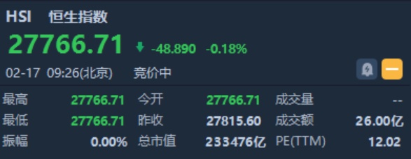 智通财经APP获悉,恒生指数开盘跌48.89点或0.18%,报27766.71点。国企指数跌0.19%,报10842.5点。红筹指数跌0.15%,报4351.1点。大市盘前成交26.01亿港元。