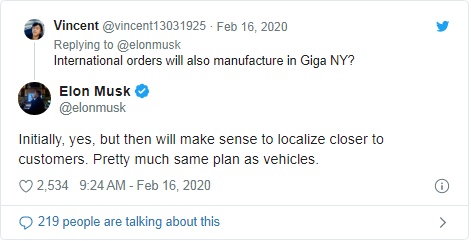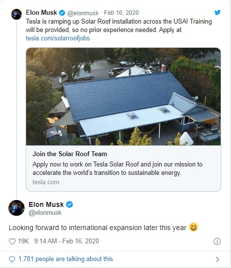 智通财经APP获悉,当地时间2月16日,特斯拉(TSLA.US)首席执行官马斯克更新推特,除了宣布在美国进一步扩展服务外,马斯克还证实,特斯拉将于今年晚些时候在国际范围内拓展太阳能屋顶业务。
