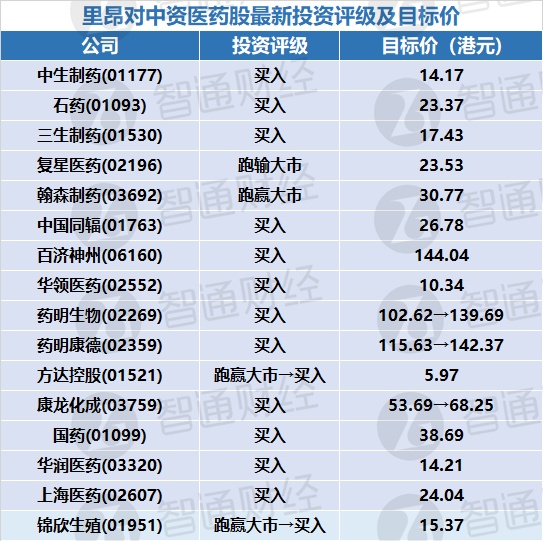 里昂对中资医药股最新投资评级及目标价(表)