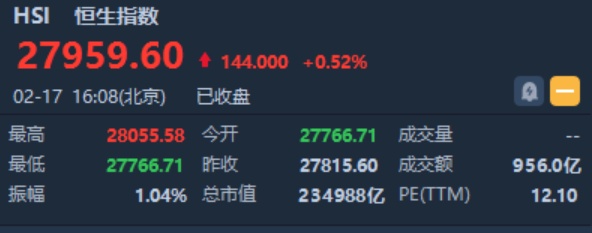 智通财经APP获悉,恒指早盘低开48.89点或0.18%,报27766.71点。截至收盘,恒生指数涨144点或0.52%,报27959.6点,全日成交额达950.04亿。国企指数涨0.87%,报10957.84点,红筹指数涨0.19%,报4365.97点。