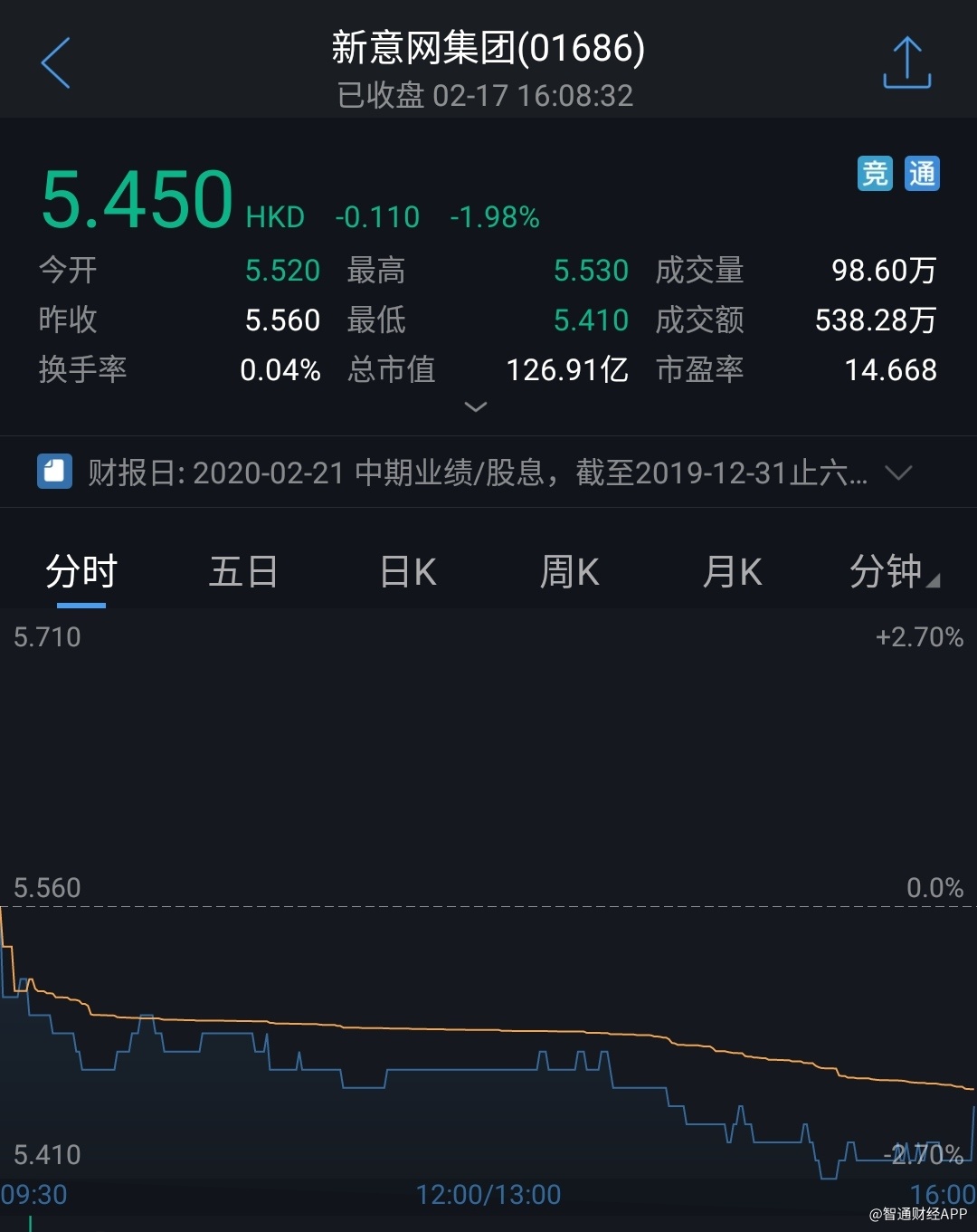 截至今日收盘,新意网跌1.98%,报5.45港元。