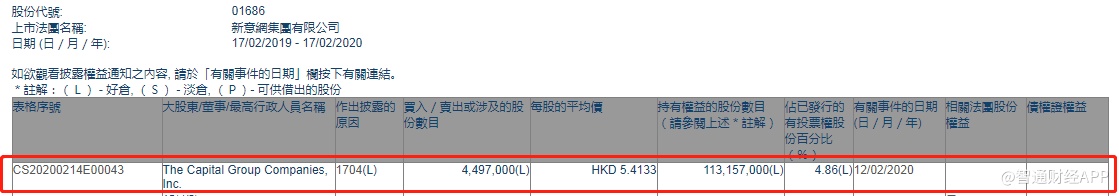 智通财经APP获悉,联交所最新资料显示,2月12日,美国资本集团减持新意网(01686)449.7万股,每股作价5.4133港元,总金额约为2434.36万港元。增持后最新持股数目约为1.13亿股,最新持股比例为4.86%。