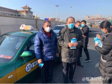 (北京汽车工作人员为出租车司机免费发放口罩)