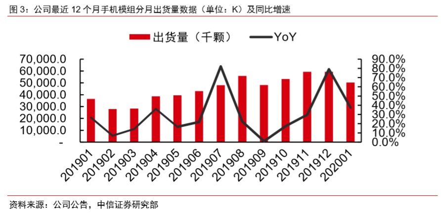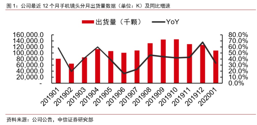 公司公布2020年1月出货量数据,其中单月手机镜头出货10,858.6万件,同比+33.2%;车载镜头出货477.2万件,同比+13.4%;手机摄像模组出货5,042.8万件,同比+37.6%;其他光电产品出货255.3万件,同比-38.5%。公司1月数据同比增速仍强劲,订单需求持续增长,我们持续看好公司所在光学行业的升级前景及公司的龙头地位。