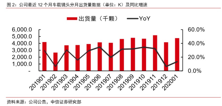 车载镜头1月出货量同比+13.4%,受益车载摄像头领域领先地位。公司车载镜头1月出货477.2万件,同比+13.4%,环比+14.2%,主要源于车载成像领域快速成长及公司车载镜头全球市占率同比上升。当前公司已实现2MP的批量供应,8MP的初步校样并与多家tier1客户建立长期合作。预计2020年随ADAS加速渗透,公司全年出货量增速将持续高于行业平均水平。