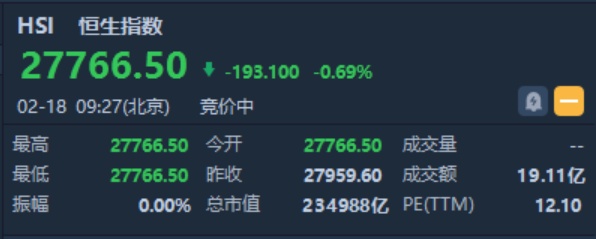 智通财经APP获悉,恒生指数开盘跌193点或0.69%,报27766.5点。国企指数跌0.86%,报10863.99点。红筹指数跌0.73%,报4333.9点。大市盘前成交19.11亿港元。
