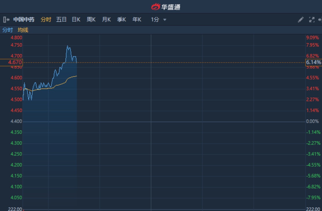 智通财经APP获悉,中国中药(00570)早盘股价放量上扬,曾一度涨近8%,截至10时32分,涨6.14%,报价4.67港元,成交额1.544亿。
