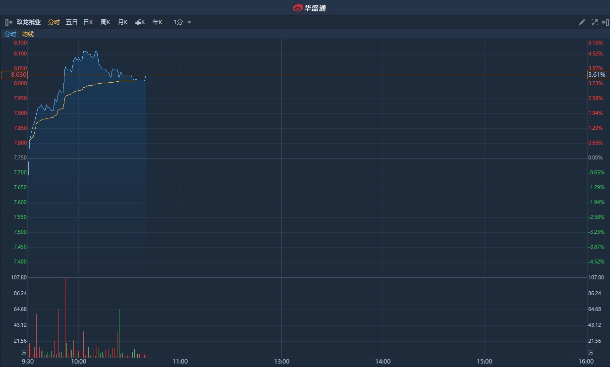 智通财经APP获悉,恒生指数公司推出恒生中国高股息率指数,玖龙纸业(02689)获纳入,且比重4.03%为最高。该股今日盘中一度涨逾4%。截至发稿,涨3.35%,报8.01港元,成交额6569.37万港元。