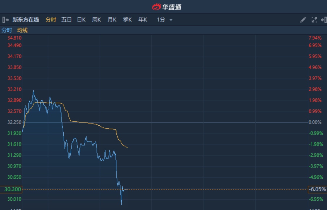智通财经APP获悉,教育部今开通国家中小学网络云平台,并免费使用。港股在线教育股盘中整体走弱,截至11时31分,新东方在线(01797)跌6.67%,报价30.1港元,成交额1.796亿。