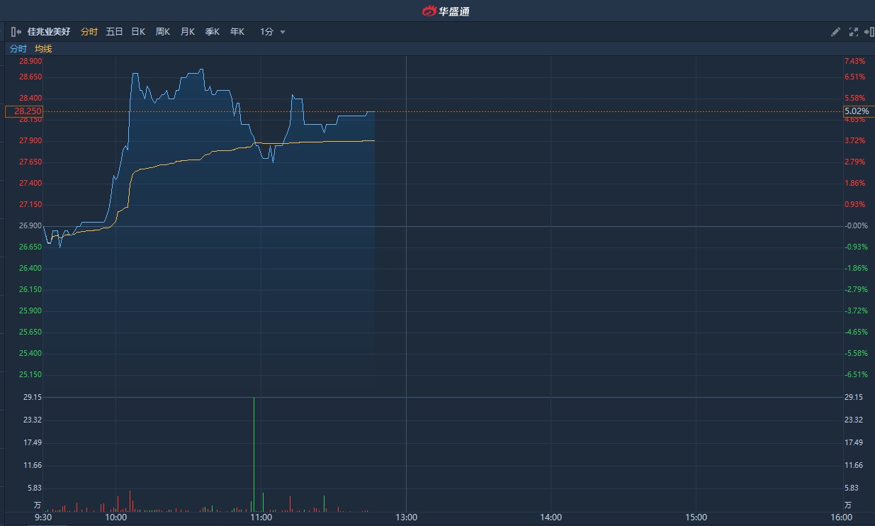 智通财经APP获悉,佳兆业美好(02168)股价近期持续攀升,今日盘中涨近7%,高见28.8港元,股价刷新历史新高。截至发稿,涨5.02%,报28.25港元,成交额2562.32万港元。