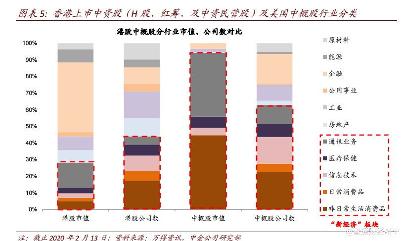 ** 行业分布偏重信息科技、消费等新经济领域。相比之下,香港中资股老经济市值占比偏高。根据GICS行业分类标准,中概股市值占比94%的公司均集中在信息科技(如软件与服务、半导体)、可选消费品(零售、旅游休闲、教育)、通讯业务以及医疗保健这四个板块(图表5)。而香港中资股市场,市值占比72%的公司集中在金融、地产、能源等老经济板块。