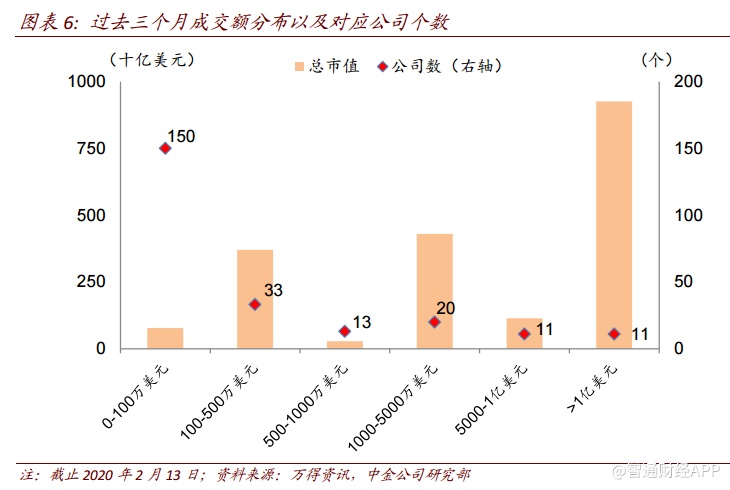 ** 流动性分化显著。大市值热门股由于受到投资者的关注,交易相对活跃。过去三个月日成交在1亿美元以上的个股包括阿里巴巴、百度、京东、瑞幸、拼多多、网易、蔚来、爱奇艺、携程、好未来、新东方,具体成交量的分布见图6。百度(BIDU.US)在过去三个月的日均成交金额高达4.6亿美元,在所有中概股中排仅次于阿里巴巴。相反,一些中小规模的公司由于不为投资者所熟知等原因,成交量低迷。