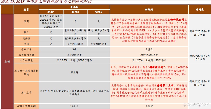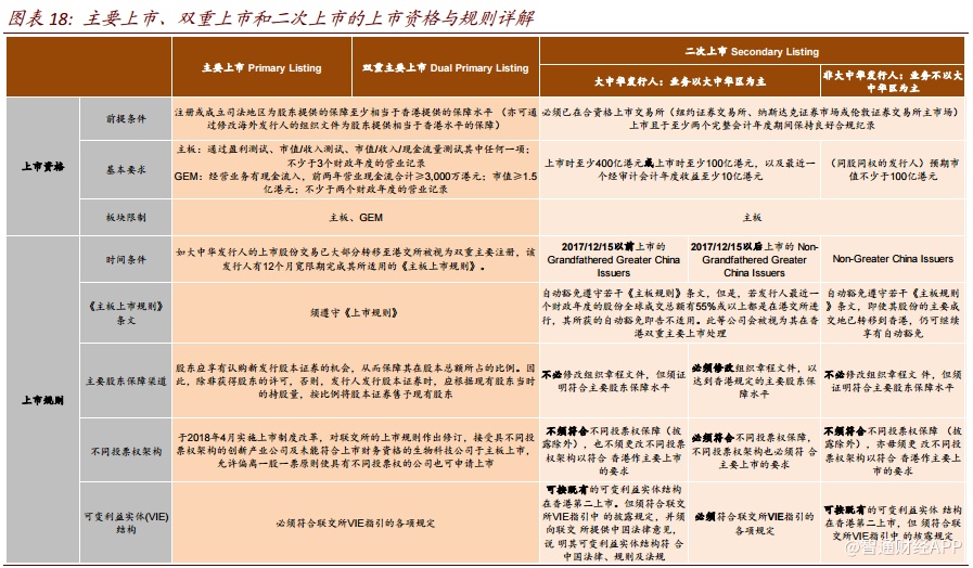 ** 以大中华为业务重心的公司在香港第二上市:可保留现行VIE 结构及不同投票权架构,但需符合以下要求:1)市值大于400亿港币;或市值大于100亿港币且最近1个财年盈利不少于10亿港币;2)2017年12月15日前在合资格交易所上市。