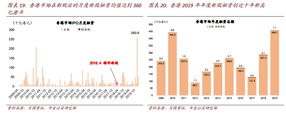 3)第二上市方面,阿里巴巴已于2019年11月26日在港交所第二上市,未来可能有更多的中概股等类别的公司选择香港作为第二上市地。我们认为,优质新经济公司上市(包括第二上市)将持续吸引更多资金沉淀、提升交易活跃度,进一步强化香港全球主要金融中心的地位,长期看来意义重大。