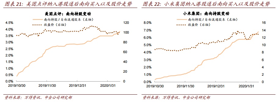 2) 增强香港市场对投资者的吸引力:香港市场广受关注的一点就是投资流动性偏低,一批有成长性的新经济类公司来到香港上市,会增加香港市场对投资者特别是大陆机构投资者的吸引力,改善香港市场流动性,长期有助于改善香港市场的生态。我们注意到,在一批具有代表性的龙头互联网公司被纳入港股通标的后,内地投资者总体在不断加大持有头寸,典型的如腾讯、美团、小米,等等,表明了在 A 股大市值新经济龙头公司稀缺的背景下,内地投资者对这类在港上市的新经济龙头公司颇有兴趣。