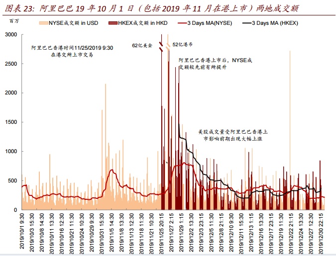 2) 阿里巴巴融资细节:阿里巴巴在香港发行股份5亿股,其中一份美股ADR对应港股8股,融资88亿港币,在港发行的股本占总股本的比例2.34%;发行价格对应的估值23.7倍市盈率/5.9 倍市净率。 3) 上市前后的交易特征:阿里巴巴在香港上市前五个交易日日均交易量90亿港币,此后至今日均交易量32亿港币,对应日均换手率3.6%。在阿里巴巴港股上市前半年,阿里巴巴美股日均交易量28 亿美元,对应换手率0.97%;在港股上市后,阿里巴巴美股日均交易量为34亿美元,对应换手率0.92%,前后并无显著变化。