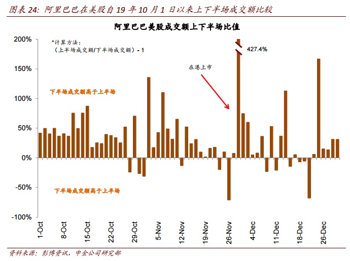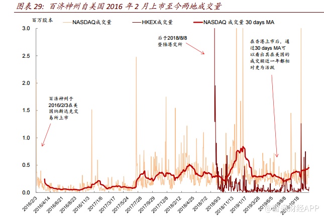 问题四:有哪些中概股已经实现回归港股,表现如何?目前包括阿里巴巴、百济神州等在内以美股为主上市地的中概股已经实现美股及港股两地上市。阿里巴巴回归港股适用上述第三类条件,在香港发行股份5亿股,融资近千亿港币;发行价格对应的估值23.7倍滚动市盈率/5.9倍市净率。阿里巴巴在香港上市前五个交易日日均交易量90亿港币,此后至今日均交易量约32亿港币,对应日均换手率2.6%,交易较为活跃。