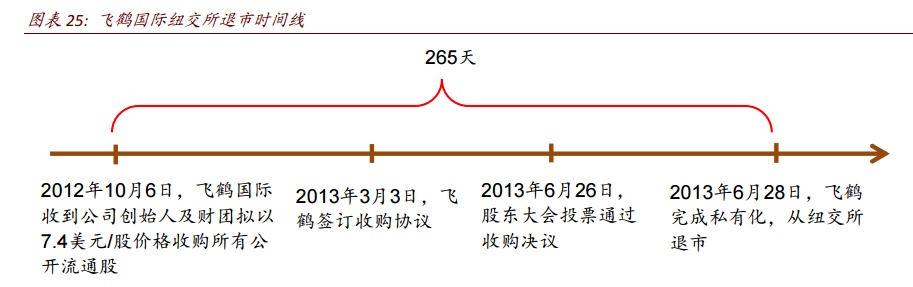 退市前股价表现:公告当日股价大涨;随后向要约价格靠拢。2012年10月6日,飞鹤国际收到创始人及其它财团的收购要约,以7.4美元/股价格收购所有公开流通股。随后5个月期间,飞鹤国际股价震荡上升。2013年3月4日,飞鹤公告表示已经签订合并协议计划,当日股价收涨2.57%,为当月单日增幅最高。股价一改过去5个月震荡向上趋势,随后3个月内逐渐逼近要约价格,于2013年6月26日达到 7.4美元/股。