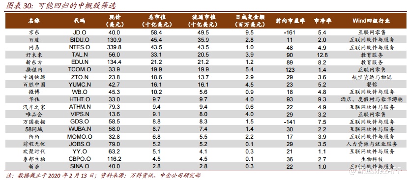 问题六:还有哪些中概股可能初步符合回归的条件?我们根据4个条件对234家中概股公司进行了梳理:1)在2017年12月15日之前已经在美股上市;2)属于新经济消费、科技、医药等领域;3)市值在400亿港币以上;或4)市值在100亿港币以上且2018年年度利润在10亿港币以上。初步符合上述条件的中概股有19家(图30),总市值约3400亿美元。如果假设这些公司在未来一到两年内逐步回归港股,平均新发行10%左右的股份,那么潜在融资金额在340亿美元左右。