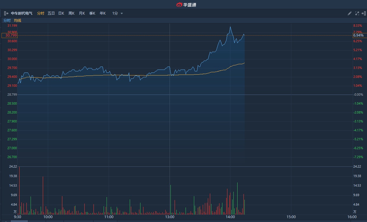 智通财经APP获悉,市场资金热捧IGBT概念,A股相关个股集体走强。H股方面,中车时代电气(03898)是国内唯一自主掌握高铁动力 IGBT芯片及模块技术的企业。该股午后获资金扫货,股价急升近8%。截至发稿,涨6.94%,报30.8港元,成交额1.67亿港元。
