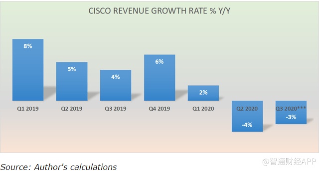 目前的事实是:思科2020年第三季度营收预计同比下降约2.5%。这并没什么大麻烦,投资者不应该担心接近持平的业绩同比增长前景。