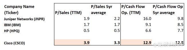 从上图,我们可以看到思科似乎并不太便宜。然而,一旦我们考虑到思科是唯一一家在三至五年时间内,不断增加经营活动现金流和盈利的公司,我们就开始真正了解到这家公司的估值到底有多便宜。