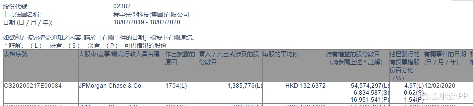 智通财经APP获悉,联交所最新资料显示,2月12日,摩根大通减持舜宇光学(02382)138.58万股,每股作价132.6372港元,总金额约为1.84亿港元。减持后最新持股数目约为5457.43万股,最新持股比例为4.97%。