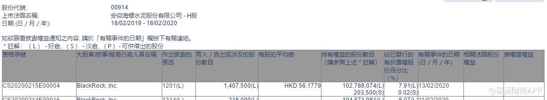 智通财经APP获悉,联交所最新资料显示,2月13日,贝莱德减持海螺水泥(00914)140.75万股,每股作价56.1779港元,总金额约为7907万港元。减持后最新持股数目约为1.03亿股,最新持股比例为7.91%。