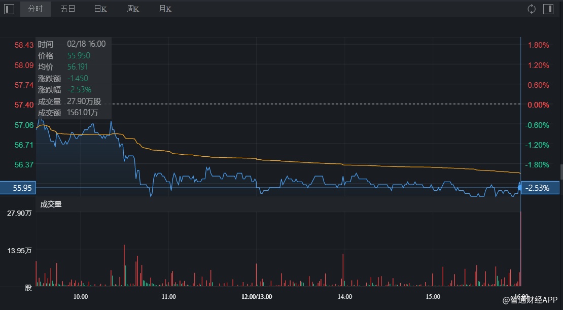 截至今日收盘,海螺水泥跌2.53%,报55.95港元。