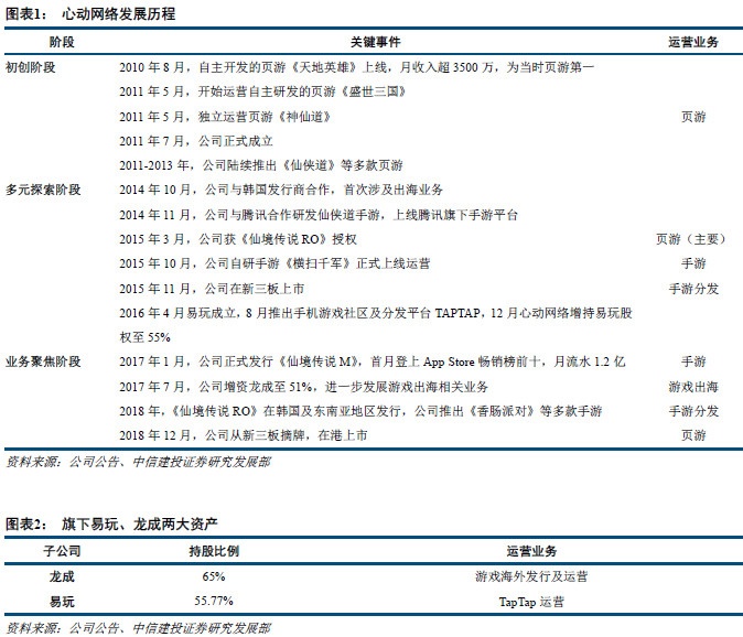 心动网络公司正式成立于2011年,作为国内领先的游戏公司,心动公司涉及游戏研发、发行、运营、动画制作等多个业务领域。公司初期主要业务为网页游戏的研发与运营,2014年之后开始涉及游戏出海及手游领域,2015年11月在新三板上市,次年成立易玩推出手机游戏社区及分发平台TapTap,心动网络在2016年12月将在易玩的股权增至55%,易玩成为其附属子公司。心动公司在2017年成立龙成,聚焦发展游戏海外业务,并于2017年8月及2018年4月两次增持龙成股份至65%。目前,心动公司业务覆盖游戏研发、分发、海内外发行及运营,形成了以手游为核心的业务链条。