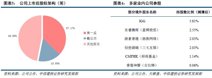 公司VIE架构,创始团队绝对控股。IPO前公司创始团队(黄一孟、戴云杰)控股比例超过60%,IPO后,公司设立VIE架构,境内实体心动网络由心动控股、黄一孟、戴云杰、赵宇尧、上海界心及其他境内股东分别直接持有47.14%、13.44%、5.76%、0.76%、10.68%及22.22%,其中黄一孟、戴云杰为公司的创始人,而心动控股为黄一孟(占比66.5%)、戴云杰(占比28.5%)和赵宇尧(占比5%)控股,公司的控股股东是创始人、执行董事、董事会主席兼首席执行官黄一孟;境外架构上,黄一孟的家族信托将通过Happy Today Limited持有公司37.17%的股份,仍为公司的控股股东,戴云杰的家族信托通过Aiks Dragon Inc.持有公司15.93%的股份。此外,心动公司还吸引到游戏业内多家公司参股:公司股东架构中,既有三七互娱、游族网络、吉比特、IGG等知名游戏公司,还引入了字节跳动、莉莉丝、米哈游、叠纸等基石投资者。