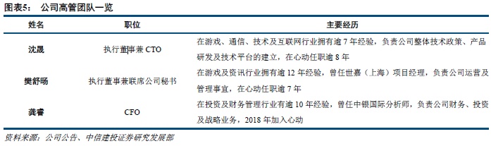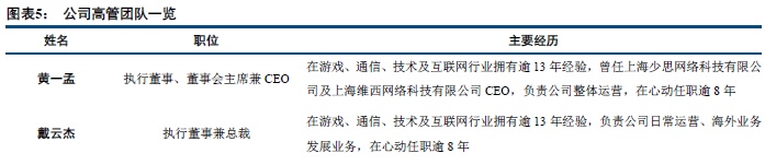 公司管理团队稳定且具有多元化背景。心动网络的董事会主席兼首席执行官是黄一孟先生,总裁为戴云杰先生。公司管理层团队稳定,黄一孟和戴云杰曾在上海少思网络科技、上海维西网络科技共事多年,管理团队职能分工明晰,沈晟、樊舒旸、龚睿等其他管理者均在游戏、技术、互联网、投资、会计及金融市场方面具有多年从业经验,丰富了团队的多元化背景。