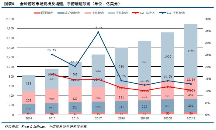 手游市场增速领跑全类型游戏市场,未来势头有望保持。根据Frost & Sullivan的资料,全球游戏市场在过去保持了稳定的增长,由2014年的820亿美元增至2018年的1399亿美元,复合年增长率为14.3%。全球游戏市场预计增长至2021年的1893亿美元,自2018年以来的复合年增长率为8.9%。手机游戏市场分部取得显著发展,由2014年的338亿美元增至2018年的780亿美元,复合年增长率为23.3%,其主要是由于移动手机的流行及移动互联网的渗透加深,此在发展中国家及地区(比如中国和东南亚)尤为明显。手机游戏市场有望保持该增长势头,于2021年达到约1128亿美元。以下为列Frost & Sullivan自2014年至2021年全球游戏市场按收入及设备划分的过往及预测的市场规模。