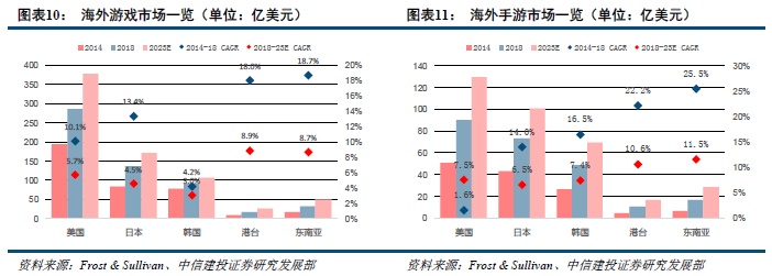 港台地区,同样由于相似的文化体系,再加上港台地区较高的经济水平及可支配收入,这些为游戏市场的发展提供了稳定的环境,尽管相对规模较小,但增长迅速,其2014-2018年游戏/手游规模年复合增速分别为18.0%/22.2%。