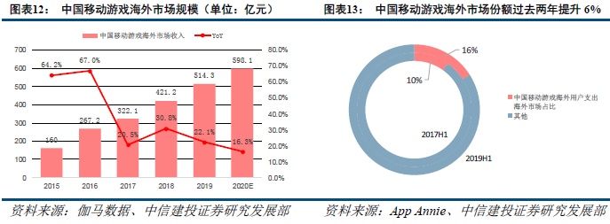 受益于全球智能手机及互联网络的普及,游戏出海成为了众多中国移动游戏产商在国内人口红利逐渐消退时的战略选择,2015-2019年,中国游戏海外市场年复合增速超40%,2018年市场规模达514.3亿人民币。据App Annie的数据显示,中国移动游戏的海外用户支出占比在2019H1达到了16%,相较于2017H1提升了6个百分点。同时由于游戏文化及审美偏好的相似性,中国游戏产商在日本、韩国及东南亚等亚洲市场取得了更佳的表现。