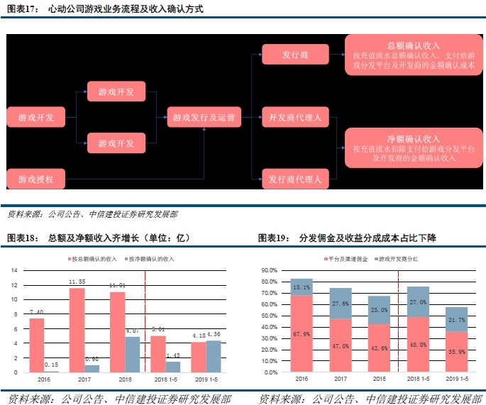 心动公司在2016-2018年按总额/净额确认的收入分别为7.4/0.15、11.55/0.98、11.01/4.87亿元,在2019 1-5月,按净额确认的收入首次超过按总额确认的收入。